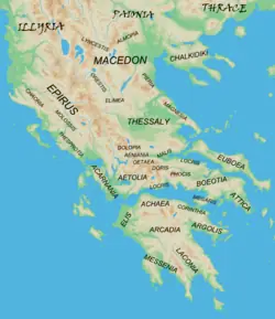 A Grécia Setentrional dividia-se em Tessália, Acarnânia e Epiro; a Grécia Central em Fócida, Etólia, Beócia (região de Tebas) e Ática (logradouro de Atenas); o Peloponeso (Grécia peninsular) em Acaia (região de Olímpia), Arcádia (logradouro de Argos, Tirinto e Micenas), Messênia (terra de Pilos) e Lacônia (região de Esparta). Entre a Grécia peninsular e continental há o istmo de Corinto (terra de Corinto e Mégara), estreita faixa litorânea, e o golfo de Corinto.[6]