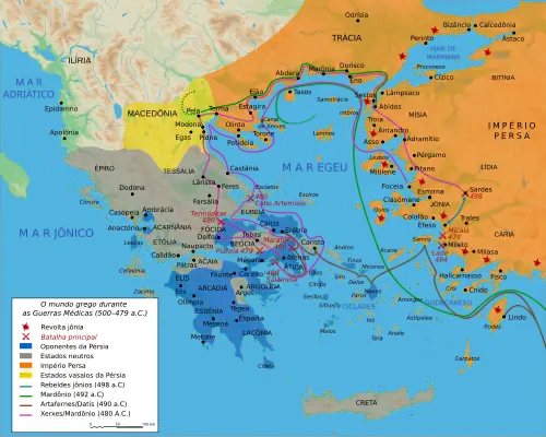 O Período Clássico estende-se entre 500 e 338 a.C. e é dominado por Esparta e Atenas. Cada um destas poleis desenvolveu o seu modelo político (a oligarquia militarista em Esparta e a democracia aristocrata em Atenas). Ao nível externo verifica-se a ascensão do Império Aquemênida quando Ciro II conquista o reino dos medos. O Império Aquemênida prossegue uma política expansionista e conquista as cidades gregas da costa da Ásia Menor. Atenas e Erétria apoiam a revolta das cidades gregas contra o domínio persa, mas este apoio revela-se insuficiente já que os jónios são derrotados: Mileto é tomada e arrasada e muitos jónios decidem fugir para as colónias do Ocidente. O comportamento de Atenas iria gerar uma reacção persa e esteve na origem das Guerras Médicas (490-479 a.C.). Perante a invasão persa, os gregos decidem esquecer as diferenças entre si e estabelecem uma aliança composta por 31 cidades, entre as quais Atenas e Esparta, tendo sido atribuída a esta última o comando das operações militares por terra e pelo mar. As forças espartanas lideradas pelo rei Leónidas I conseguem temporariamente bloquear os persas na Batalha das Termópilas, mas tal não impede a invasão da Ática. O general Temístocles tinha optado por evacuar a população da Ática para Salamina e sob a direcção desta figura Atenas consegue uma vitória sobre os persas em Salamina. Em 479 a.C. os gregos confirmam a sua vitória desta feita na Batalha de Plateias. A frota persa foge para o mar Egeu, onde em 479 a.C. é vencida em Mícale.[60]