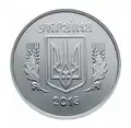 1 kopiyka | 16 milímetros | 1,5g | Aço inoxidável | Simples | Tridente Ucraniano | 1992–2016 | 2 de setembro de 1996 | Não emitido desde 1 de julho de 2018.[15] As moedas de 1, 2 e 5 kopiika foram retiradas da circulação geral em 1 de outubro de 2019.[10] | ||