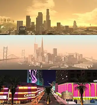 Os eventos de San Andreas acontecem em 1992 no estado fictício de San Andreas, nos Estados Unidos — com base no retrato do início dos anos 1990 dos estados da Califórnia e Nevada — que consiste em três cidades principais: Los Santos (baseada em Los Angeles), San Fierro (com base em São Francisco) e Las Venturas (baseada em Las Vegas). Várias regiões de floresta, deserto e pequenas cidades rurais estão espalhadas entre as grandes cidades.[27] Los Santos é circundada pela região rural de Red County, enquanto que San Fierro tem seu arredores compostos pela região florestal e montanhosa de Flint County e Whetstone. Las Venturas faz fronteira com a região desértica de Bone County — onde fica localizada a zona restrita Area 69 (inspirada na base militar Área 51 da Força Aérea dos Estados Unidos, em Nevada)[28] — que faz divisa com o condado de Tierra Robada.[29] Liberty City, a cidade apresentada em Grand Theft Auto III que é baseada levemente na cidade de Nova Iorque, também faz uma pequena aparição no jogo.[30]