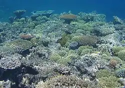 Os crocodilos-de-água-salgada vivem em pântanos de mangue e sal próximo ao recife.[16] A distribuição da população ainda não foi estudada, mas a densidade é ampla, porém baixa.[17] Cerca de 125 espécies de tubarões e arraias vivem no recife.[18][19] Perto de 5 000 espécies de moluscos foram registrados no recife, incluindo a ostra-gigante e vários nudibrânquios e conus.[11] Quarenta e nove espécies de pipefish e nove espécies de cavalos-marinhos foram registradas.[17] Pelo menos sete espécies de sapos habitam as ilhas.[20]