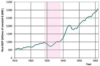 A Grande Depressão, também conhecida como Crise de 1929, foi a maior crise financeira na história dos Estados Unidos,[2] que teve início em 1929 e persistiu ao longo da década de 1930, terminando apenas com a Segunda Guerra Mundial. A Grande Depressão é considerada o pior e o mais longo período de recessão econômica do sistema capitalista do século XX. Este período de depressão econômica causou altas taxas de desemprego, quedas drásticas do produto interno bruto de diversos países, bem como quedas drásticas na produção industrial, preços de ações, e em praticamente todo o medidor de atividade econômica, em diversos países no mundo.[3]