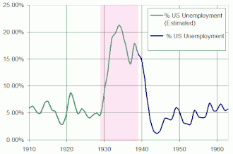 Porém, apesar dos programas governamentais criados com o intuito de reduzir o desemprego, cerca de 15% da força de trabalho americana continuava desempregada em 1940. Foi necessária a entrada do país na Segunda Guerra Mundial para que as taxas de desemprego caíssem aos níveis de 1930, de 9%. Apesar da entrada na Segunda Guerra Mundial ter atrasado a recuperação econômica por 7 anos, a venda de armas para os ingleses acelerou a recuperação econômica[23] e a produção industrial americana cresceu drasticamente, e as taxas de desemprego caíram. No final da guerra, apenas 1% da força de trabalho americana estava desempregada. O gasto do governo norte-americano da Segunda Guerra Mundial foi de 4,1 trilhões de dólares em valores correntes de 2011.[24]