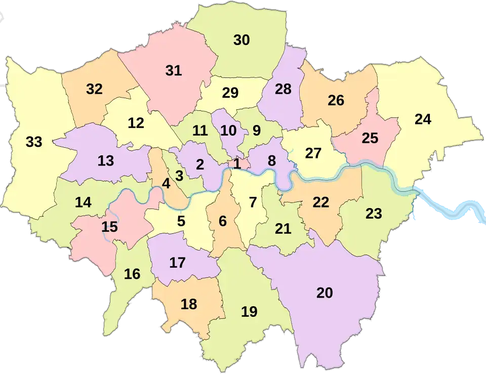 A Grande Londres é dividida em 32 boroughs, cada um governado por um conselho. A Cidade de Londres tem um governo único que remonta ao século XII e é separada do condado da Grande Londres, embora ainda faça parte da região atendida pela Autoridade da Grande Londres.[26]