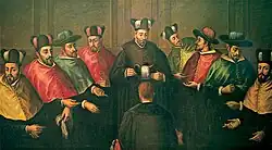 Ato da concessão do grau de doutor, com a imposição do barrete doutoral, na Universidade Complutense de Madrid, durante o século XVII