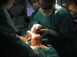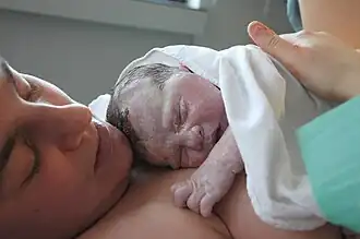 O parto é o processo pelo qual nasce o bebé. Considera-se que a mulher está em trabalho de parto quando começa a sentir contrações uterinas em intervalos regulares e progressivas que gradualmente fazem descer o feto pelo colo do útero e pela vagina (canal de parto) até à sua expulsão para o exterior. Estas contrações são acompanhadas por alterações no colo do útero, o qual dilata e se torna cada vez mais fino até desaparecer. Embora a maior parte dos nascimentos ocorra por parto vaginal, podem surgir determinadas complicações que obriguem à realização de uma cesariana.[52]
