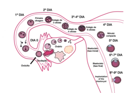 Nos seres humanos, a embriogénese, ou período embrionário, tem início com a fecundação e prolonga-se até ao início do período fetal. Após a fecundação, o zigoto desloca-se lentamente ao longo da trompa de Falópio em direção ao útero. Ao longo desta viagem de mais de uma semana, o zigoto divide-se em células idênticas. Esta divisão celular tem início aproximadamente entre 24 a 36 horas após a fecundação. Ao fim do 4º dia de divisão celular, o zigoto dá origem a uma esfera sólida de 16 ou 32 células denominada mórula. Ao chegar ao útero, cinco dias após a fecundação, esta esfera apresenta-se oca e tem entre 50 e 100 células. Nesta fase passa a ser denominada blastócito, demorando cerca de seis dias até nidificar na parede uterina. O revestimento de proteínas do blastócito dissolve-se, o que permite às suas células trofoblásticas entrar em contacto e aderir às células endometriais da parede uterina. O embrião une-se com o endométrio através de um processo denominado nidação, que ocorre oito a dez dias após a ovulação. Após alguns dias, forma-se o celoma extra-embrionário que se tornará na cavidade coriónica, a qual irá conter o embrião, o líquido amniótico e o cordão umbilical. Desenvolve-se também a cavidade amniótica entre o citotrofoblasto e a massa de células interna. Desenvolve-se também a placa pré-cordal, que indica o futuro local da boca e da região cranial. Nesta fase, o embrião cresce rapidamente e começam a tomar forma as principais características externas. Este processo, denominado diferenciação celular, produz os diferentes tipos de células do organismo.[41][42][43]