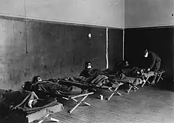 ![]() Soldados de Fort Riley, Kansas, doentes de gripe espanhola, sendo tratados em uma enfermaria de Camp Funston. | |