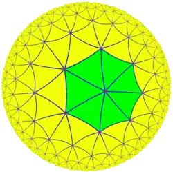 Grupos de simetria são grupos consistindo em simetrias de objetos matemáticos dados, principalmente entidades geométricas, como o grupo de simetria do quadrado fornecido como exemplo introdutório acima, embora eles também surjam na álgebra, como as simetrias entre as raízes de equações polinomiais tratadas na teoria de Galois (veja abaixo).[25] Conceitualmente, a teoria dos grupos pode ser pensada como o estudo da simetria.[l] As simetrias na matemática simplificam muito o estudo de objetos geométricos ou analíticos. Diz-se que um grupo atua em outro objeto matemático se cada elemento do grupo puder ser associado a alguma operação em e a composição dessas operações seguir a lei do grupo. Por exemplo, um elemento do grupo de triângulo (2,3,7) atua sobre um ladrilhamento triangular do plano hiperbólico permutando os triângulos.[24] Por meio de uma ação de grupo, o padrão do grupo é conectado à estrutura do objeto no qual atua.
