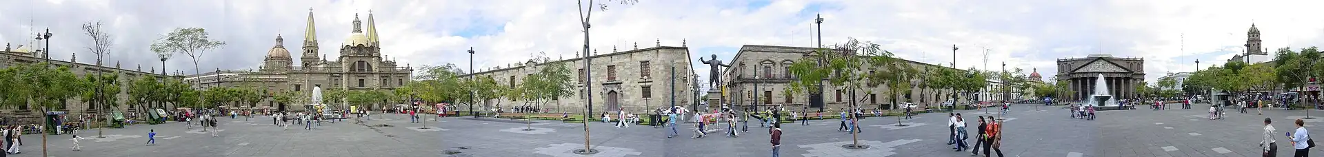 A Rotunda dos Homens Ilustres é um monumento circular de pedra. Foi construído para honrar a memória de pessoas ilustres de Jalisco. Foi construído em 1952 e contém colunas que marcam um espaço circular contendo 98 urnas com os restos mortais dos honrados. Do outro lado da rua, está o Palácio Municipal, que foi construído em 1952. Possui quatro fachadas de pedra e design neoclássico com elementos como pátios, entradas e colunas que imitam as estruturas mais antigas da cidade. O Palácio do Governo do Estado está em estilo neoclássico e churrigueresco, tendo sido iniciado no século XVII e concluído em 1774. O interior foi completamente remodelado, após uma explosão em 1859. Este edifício contém uma série de pinturas murais feitas por José Clemente Orozco, um nativo de Jalisco e inclui Lucha Social, Circo Político e Las Fuerzas Ocultas. A última retrata Miguel Hidalgo y Costilla com o braço levantado acima de sua cabeça, com raiva contra o governo e a Igreja.