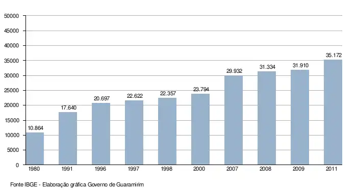 Segundo os resultados dos últimos censos, a população da cidade elevou-se de 17.640 habitantes, em 1991, para 29.932 habitantes em 2007, alcançando 35.172 em 2011. O município de Guaramirim (268,119 km²), teve sua população aumentada, elevando-se sua densidade demográfica para 131,18 hab./km².