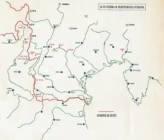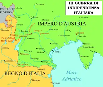 Os austríacos tiveram melhor sorte na guerra com a Itália, derrotando-a em terra na Batalha de Custoza (24 de junho) e no mar na Batalha de Lissa (20 de julho). Os "Caçadores dos Alpes", de Garibaldi, invadiram o Tirol Meridional (atual Trentino) na Batalha de Bezzecca, em 21 de julho, e avançaram na direção de Trento, sem todavia tomar a cidade.