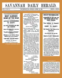 Impondo um bloqueio naval cada vez mais rigoroso aos portos confederados, a União mobilizou recursos e mão de obra para atacar a Confederação por todos os lados. Isso levou à queda de Atlanta em 1864, conquistada pelo general da União William Tecumseh Sherman, seguida por sua Marcha para o Mar, que culminou na tomada de Savannah. As últimas batalhas significativas ocorreram em torno do cerco de dez meses a Petersburg, porta de entrada para a capital confederada de Richmond. Os confederados abandonaram Richmond e, em 9 de abril de 1865, Lee rendeu-se a Grant após a Batalha de Appomattox Court House, dando início ao fim da guerra.[f] Lincoln viveu para testemunhar essa vitória, mas foi baleado por um assassino em 14 de abril, morrendo no dia seguinte.