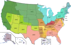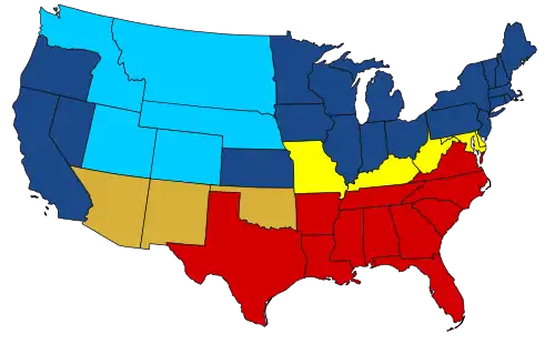 Maryland, Delaware, Missouri, Virgínia Ocidental e Kentucky eram estados escravistas cujos habitantes tinham lealdades divididas entre os interesses comerciais e familiares do Norte e do Sul. Alguns homens se alistaram no Exército da União e outros no Exército Confederado.[60] A Virgínia Ocidental separou-se da Virgínia e foi admitida na União em 20 de junho de 1863, embora metade de seus condados fosse secessionista.[61]