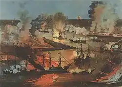 A Marinha da União em 1861 era relativamente pequena, mas, em 1865, expandiu-se rapidamente para 6.000 oficiais, 45.000 marinheiros e 671 navios, totalizando 510.396 toneladas.[108][109] Sua missão era bloquear os portos confederados, controlar o sistema fluvial, defender-se contra os corsários confederados em alto-mar e estar pronta para uma possível guerra com a Marinha Real Britânica.[110] A principal guerra fluvial foi travada no Oeste, onde os principais rios davam acesso ao coração do território confederado. A Marinha da União acabou controlando os rios Red, Tennessee, Cumberland, Mississippi e Ohio. No Leste, a Marinha bombardeou fortes confederados e apoiou as operações do exército na costa.[111]