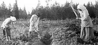 Agricultores nos campos. Muitos finlandeses eram trabalhadores agrários e arrendatários de terra, que não possuíam qualquer influência política na sociedade de classes que existiu antes da reforma parlamentarista em 1906.