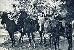 Oficiais vermelhos em seus cavalos.