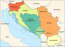 A Guerra Civil Iugoslava (português brasileiro) ou Jugoslava (português europeu) ou Guerras Iugoslavas (português brasileiro) ou Jugoslavas (português europeu) foram uma série de conflitos étnicos separados, mas relacionados,[9][10][11] guerras de independência e insurgências que ocorreram na República Socialista Federativa da Iugoslávia de 1991 a 2001.[13] Os conflitos levaram e resultaram da divisão da Iugoslávia, que começou em meados de 1991, em seis países independentes, correspondentes às seis entidades conhecidas como repúblicas que anteriormente constituíam a Iugoslávia: Eslovênia, Croácia, Bósnia e Herzegovina, Montenegro, Sérvia e Macedônia (agora chamada de Macedônia do Norte). As repúblicas constituintes da Iugoslávia declararam independência devido a tensões não resolvidas entre as minorias étnicas nos novos países, que alimentaram as guerras. Embora a maioria dos conflitos tenha terminado através de acordos de paz que envolveram o pleno reconhecimento internacional de novos Estados, resultaram num número enorme de mortes, bem como em graves danos económicos para a região.