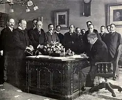 As hostilidades foram interrompidas em 12 de agosto de 1898, com a assinatura em Washington de um Protocolo de Paz entre os Estados Unidos e Espanha.[76] Depois de mais de dois meses de difíceis negociações, o tratado de paz formal, o Tratado de Paris, foi assinado em Paris em 10 de dezembro de 1898,[17] e foi ratificado pelo Senado dos Estados Unidos em 6 de fevereiro de 1899.