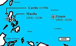 A primeira batalha entre as forças americanas e espanholas foi na Baía de Manila, onde, em 1 de maio, Comodoro George Dewey, comandando a Esquadra Asiática da Marinha os Estados Unidos a bordo do USS Olympia, em questão de horas derrotou uma esquadra espanhola sob o almirante Patricio Montojo. Dewey conseguiu isso com apenas nove feridos.[50][51] Com a apreensão alemã de Tsingtao, em 1897, a esquadra de Dewey tornou-se a única força naval no Extremo Oriente, sem uma base local própria, e cheia de carvão e problemas de munições.[52] Apesar desses problemas, a Esquadra Asiática não só destruiu a frota espanhola, mas também capturou o porto de Manila.[52]