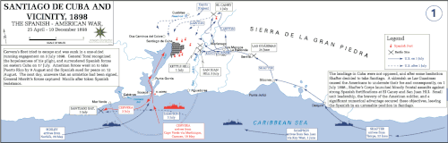 A Batalha de Santiago de Cuba em 3 de julho, foi a maior batalha naval da Guerra Hispano-Americana e resultou na destruição da Esquadra do Caribe espanhola (também conhecida como a Flota de Ultramar). Em maio, a frota do almirante espanhol Pascual Cervera y Topete fora avistado por forças americanas no porto de Santiago, onde tinham tomado abrigo para proteção contra ataques do mar. A dois meses de impasse entre as forças navais espanholas e americanas seguiram.