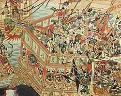 - ↑ Algumas fontes citam 300 barcos inimigos. Nanjung Ilgi; Ha Tae Hung (tradução) (1977). Sohn Pow-key, ed. War Diary of Admiral Yi Sun-sin. Seoul, Coreia: Yonsei University Press. p. 312. ISBN 89-7141-018-3
