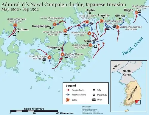 Depois de um rápido e eficaz avanço das tropas japonesas pelo território coreano, a campanha naval do Almirante Yi cortou o fornecimento de recursos para os invasores, obrigando-os a parar seu avanço. A milícia coreana, junto com a intervenção do exército chinês, obrigou o governo japonês a iniciar relações de paz com a China em 1593. Após os pedidos de Hideyoshi terem sido negados, a guerra entrou em uma nova fase em 1597, quando se retomaram as hostilidades.[11] O confronto terminou em 1598 com a retirada total das tropas invasoras seguinte a morte de Hideyoshi.[12]