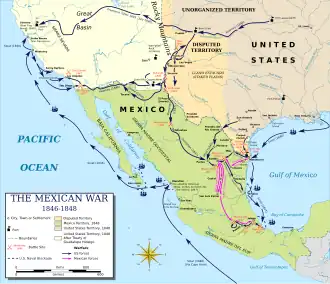 As políticas seccionais sobre escravidão nos Estados Unidos estavam impedindo a anexação porque o Texas, antes um território livre de escravidão sob o domínio mexicano, teria sido admitido como um estado escravista, perturbando o equilíbrio de poder entre os estados livres do Norte e os estados escravistas do Sul.[6] Na eleição presidencial nos Estados Unidos em 1844, o democrata James K. Polk foi eleito em uma plataforma de expansão do território estadunidense para o Oregon, Califórnia (também um território mexicano) e Texas, de qualquer maneira possível, com a anexação do Texas em 1845 promovendo esse objetivo.[7] No entanto, a fronteira entre o Texas e o México foi contestada, com a República Texana e os Estados Unidos afirmando que ela deveria ser delimitada pelo Rio Grande e os mexicanos alegando que deveria ser mais ao norte do Rio Nueces. Polk enviou então uma missão diplomática ao México na tentativa de comprar o território disputado, juntamente com a Califórnia e todo o resto, por um valor de US$ 25 milhões de dólares (aproximadamente US$ 750,7 milhões em valores de 2022), uma oferta que o governo mexicano recusou.[8] Polk então enviou um grupo de 80 soldados através do território disputado até o Rio Grande, ignorando as exigências mexicanas para se retirar.[9][10] O exército mexicano interpretou isso como o início de uma invasão em larga escala e expulsou os militares americanos do seu território em abril de 1846, um movimento que Polk usou para convencer o Congresso dos Estados Unidos a declarar guerra.[9]