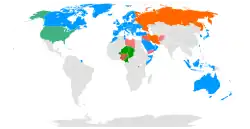 ![]() Acima: Aviões estadunidenses sobrevoando o norte do Iraque. Esquerda: F-22 Raptor reabastecendo combustível antes de bombardear a Síria. Direita: Soldados peshmerga reunidos perto da Síria. Abaixo: Avião estadunidense a bordo de um porta-aviões antes de decolar para o Iraque. ![]() Mapa - Um mapa de todos os oponentes do Estado Islâmico: Coalizão liderada pelos Estados Unidos Aliança Rússia–Síria–Irã–Iraque Frente nigeriana Presença do Estado Islâmico | |||