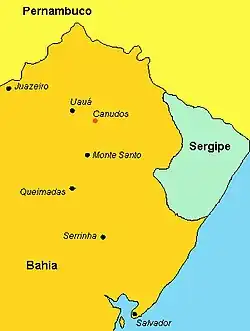 Canudos era uma pequena aldeia que surgiu durante o século XVIII nos arredores da Fazenda Canudos, às margens do rio Vaza-Barris. Com a chegada de Antônio Conselheiro em 1893 passou a crescer vertiginosamente, em poucos anos chegando a contar por volta de 25 000 habitantes. Antônio Conselheiro rebatizou o local de Belo Monte, apesar de estar situado num vale, entre colinas.