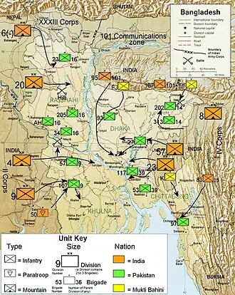 | Desfecho | Vitória da Índia e dos Mukti Bahini sobre o Paquistão e subsequente independência do Bangladesh. | ||