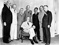 Antes do ataque a Pearl Harbor, o movimento isolacionista nos Estados Unidos estava em alta. O comitê conhecido como America First tinha mais de 800 000 membros que veemente se opunham a qualquer intervenção americana na guerra na Europa, mesmo com o país vendendo equipamentos militares e fazendo enormes empréstimos para o Reino Unido e para a União Soviética através do programa Lend-Lease. Contudo, após o bombardeio japonês a Pearl Harbor, a oposição a guerra praticamente desapareceu do dia para a noite. A 8 de dezembro, o congresso dos Estados Unidos aceitou o pedido do presidente Franklin Roosevelt e declarou formalmente guerra ao Império do Japão.[33] Outros países, como o Reino Unido,[34] Canadá,[35] e a Holanda[36] também declararam guerra aos japoneses, seguidos em similar atitude pela China[37] e a Austrália.[38] Quatro dias após Pearl Harbor, a Alemanha Nazista e a Itália Fascista declararam guerra aos Estados Unidos, atraindo os americanos também para a guerra europeia. Os alemães, erroneamente, acreditavam que fazendo este gesto em apoio ao seu aliado, o Japão poderia distrair os americanos no Pacífico e reduzir seu apoio aos britânicos, ou ainda mesmo auxiliar os nazistas na sua luta contra os soviéticos. Contudo, os Estados Unidos conseguiram manter-se na luta em duas frentes, mantendo enormes exércitos em várias partes do mundo ao mesmo tempo.