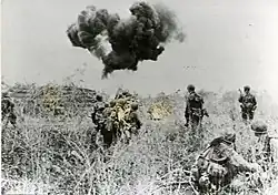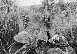Ao fim de 1942, os japoneses haviam feito de manter Guadalcanal uma de suas prioridades. As tropas que avançavam contra Port Moresby, receberam ordens para se retirar e reforçar a luta do outro lado de Nova Guiné. Os australianos e americanos então atacaram suas posições fortificadas e, após dois meses de luta, a região de Buna–Gona foi tomada.[65]