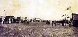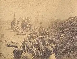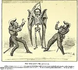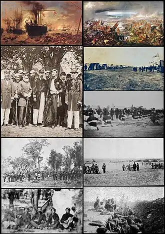 ![]() Cenas da Guerra do Paraguai, da esquerda para a direita: 1. Batalha do Riachuelo; 2. Batalha de Avaí; 3. Oficiais brasileiros nos momentos finais da Guerra do Paraguai, entre eles está o Conde d´Eu (com a mão na cintura); 4. Acampamento aliado na Guerra; 5. Soldados brasileiros ajoelham-se diante da estátua de Nossa Senhora da Conceição durante uma procissão; 6. Membros do Batalhão de Voluntários da Pátria, regimento proveniente da longínqua província do Ceará; 7. Artilharia uruguaia na Batalha do Boqueirão; 8. Oficiais argentinos em Tuiuti e 9. Soldados uruguaios entrincheirados na Batalha de Tuiuti. | |||
