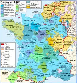 Mais do que a sua população, o Reino também é imponente no seu tamanho. Na coroação de Filipe VI de Valois, a França estendia-se do Escalda aos Pirenéus, do Oceano Atlântico ao Ródano, ao Saône e ao Mosa, país que demorava " 22 dias a atravessar de norte a sul e 16 de leste a oeste”, segundo Gilles Le Bouvier no século XV, ou seja, quase 424 000 km2.[8][9] Quase sessenta regiões diferem entre si por grandes disparidades linguísticas, culturais, históricas e até, em certas épocas, religiosas (como os cátaros no sul). Assim, o Norte do Reino, falando a langue d'oïl e, perto do berço da dinastia Capetiana, tinha ricas terras agrícolas e uma população maior (14 famílias por km2 NA Île-de-France e até 22 famílias por km2 2 em bailiwicks de Senlis e Valois para uma média de 7,9 agregados familiares por km 2[4]) claramente diferente do Sul. Esta última, onde se utilizava a langue d'oc, tinha uma cultura imbuída da antiga presença romana, mas também era mais pobre em termos agrícolas (por outro lado, a pecuária era mais rica) e menos povoada (cerca de 4 agregados familiares por km2 para os condado de Bigorra, Bearne por exemplo), mas acima de tudo era mais independente face ao rei, porque se este transferisse parte da sua autoridade para as mãos dos seus vassalos, deveria ter em conta a opinião dos mesmos. Contudo, o soberano não hesitou em interferir na política interna dos seus subordinados já que desde o século XII gozava de poderes até então sem paralelo. Ele estava no topo de uma pirâmide onde os níveis mais baixos lhe deviam lealdade.[10]