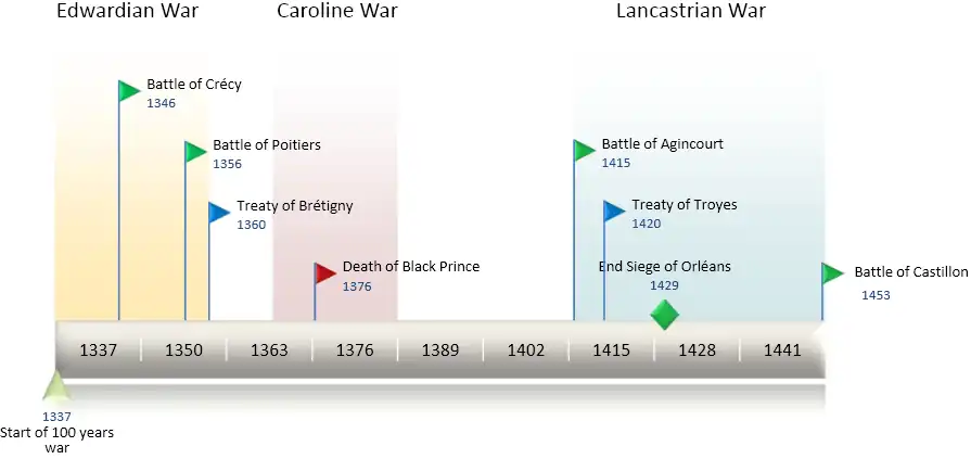 O termo "Guerra dos Cem Anos" foi adotado por historiadores posteriores como uma periodização historiográfica para abranger conflitos relacionados, construindo o conflito militar mais longo da história europeia. A guerra é comumente dividida em três fases separadas por tréguas: a Guerra Eduardiana (1337-1360), Guerra Carolina (1369-1389) e a Guerra Lancastriana (1415-1453). Cada lado atraiu muitos aliados para o conflito, com as forças inglesas inicialmente prevalecendo; a Casa de Valois finalmente manteve o controle sobre a França, com as monarquias francesas e inglesas anteriormente entrelaçadas permanecendo separadas.