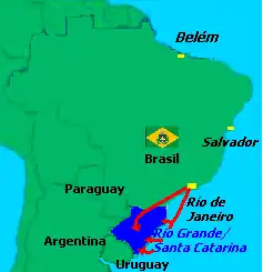De Rio Grande, Fernandes Braga embarcou para o Rio de Janeiro em 23 de outubro,[7] capital do Império do Brasil. Uma vez na Corte, Braga passou a sua versão da história, bastante diferente da carta enviada por Bento Gonçalves. O novo indicado, José de Araújo Ribeiro,[32] veio acompanhado de um verdadeiro aparato de guerra: onze brigues e escunas, além de diversas canhoneiras, lanchas e iates,[30] carregados de armamento e muitos soldados imperiais, sob o comando do capitão de mar e guerra John Pascoe Grenfell.