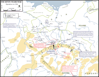 Durante o ano de 1756, as tropas prussianas conquistaram uma série de vitórias. Frederico II invadiu a Boêmia e, em 6 de maio de 1757, bateu os austríacos na disputada Batalha de Praga. Mas no dia 18 de junho, Frederico acabou sendo derrotado pelo marechal austríaco Daun em Kolin, o que o obrigou a abandonar a Boêmia. A Prússia, a partir de então, foi obrigada a enfrentar uma guerra defensiva em três frentes: a Suécia atacou a Pomerânia; as tropas russas invadiram a região oriental do território prussiano, obtendo uma importante vitória; a França penetrou na Prússia ocidental e os austríacos marcharam sobre a Silésia.