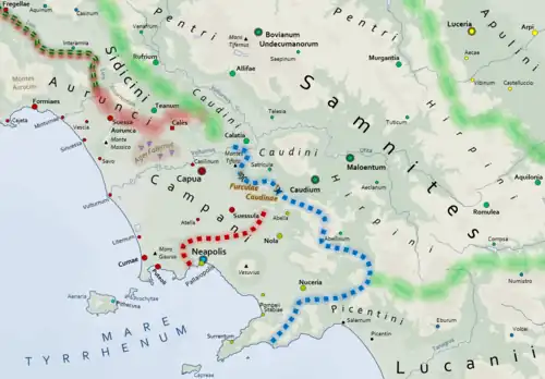 A Segunda Guerra Samnita foi o resultado das tensões provocadas pelas repetidas intervenções romanas na Campânia. A causa imediata foi a fundação de uma colônia romana em Fregelas em 328 a.C. e ações realizadas pelos habitantes de Paleópolis. Fregelas era uma antiga cidade volsca na margem sul do rio Liris, perto da confluência com o rio Treso (moderno rio Sacco), ou seja, na Campânia e na área de influência reservada aos samnitas. Ela foi capturada dos volscos e destruída pelos samnitas. Paleópolis ("cidade velha") era um antigo assentamento grego na região onde hoje está Nápoles e ficava perto de um assentamento mais novo e muito maior, Neápolis ("cidade nova"). Lívio afirma que ela atacou os romanos que viviam na Campânia e, depois que os feciais não conseguiram obter as reparações devidas, a guerra foi declarada. Em 327 a.C., os dois exércitos consulares seguiram para a Campânia. O cônsul Quinto Publílio Filão tomou Nápoles e seu colega, Lúcio Cornélio Lêntulo, se posicionou no interior para interceptar qualquer movimentação samnita, uma vez que havia relatos de que um grande alistamento estava ocorrendo em Sâmnio para formar um exército para intervir na Campânia. A vizinha cidade campana enviou 2 000 soldados a Paleópolis/Neápolis e os samnitas, mais 4 000. Em Roma, rumores indicavam que os samnitas estavam incitando revoltas nas cidades de Priverno, Fundos e Fórmias, cidades volscas na margem norte do rio Liris. Os romanos enviaram emissários até Sâmnio e os samnitas afirmaram que não estavam se preparando para a guerra e nem incitando revoltas. Afirmaram também que os samnitas em Paleópolis não foram enviados pelo estado samnita, ou seja, eram mercenários samnitas contratados pelos campânios. Além disso, eles reclamaram da fundação de Frégelas, o que eles consideraram um ato de agressão, pois eles haviam acabado de invadir a região.[56]