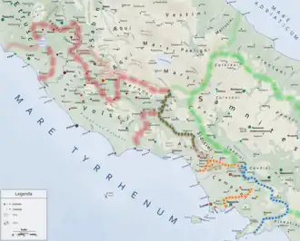 Quando as Guerras Samnitas terminaram, os romanos voltaram sua atenção para os sabinos que viviam nas montanhas a leste de Roma. Mânio Cúrio Dentato invadiu o território sabino entre os rios Nar (moderno rio Nera, o principal afluente do Tibre) e Ânio e a nascente do rio Velino. Espúrio Carvílio Máximo confiscou grandes porções do território na planície à volta de Reate e Amiterno e distribuiu as terras para colonos romanos.[122] Floro não cita o motivo desta guerra e Salmon (1967) especula que "pode ter sido por causa do papel que eles tiveram ou não quiseram ter nos eventos de 296-5 a.C.".[123] Os sabinos permitiram que samnitas cruzassem seu território para chegar até a Etrúria. Forsythe (2006) também especula que esta campanha seria uma punição por isto.[124] Lívio menciona ainda que Dentato subjugou os revoltosos sabinos,[125] que receberam a duvidosa honra da "civitate sine suffragio" ("cidadania sem direito a voto"), o que, na prática, significava que seu território foi anexado pela República Romana. Reate e Amiterno receberam cidadania plena ("civitas optimo iure") em 268 a.C..