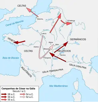 Após atravessar a Gália Transalpina, César expulsou as tribos germânicas fixadas ao sul e ao leste, as belgas ao norte e os vênetos a oeste. Atravessou o Reno para mostrar o poder de controle das fronteiras. Favorecido pela desunião intertribal, subjugou implacavelmente as costas norte e oeste. Invadiu duas vezes (55 a.C. e 54 a.C.) a Bretanha, que era vista como refúgio belga e ameaça para Roma. No inverno de 53 a.C.-52 a.C., Vercingetórix reuniu as tribos da Gália central numa unidade incomum, promovendo a insurreição dos povos da Gália iniciado com o massacre dos Romanos em Orléans. Em longa e amarga batalha, César derrotou Vercingetórix e os seus sucessores, culminando na rendição do chefe gaulês.