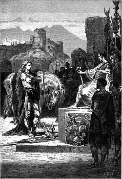 E foi assim que procedeu. Montando no seu corcel, vestido de luzente armadura, Vercingetórix cavalgou para o acampamento do inimigo. César recebeu-o num tablado improvisado, onde sentava num pequeno trono. Ordenou ao vencido que entregasse o cavalo e suas armas a guarda.