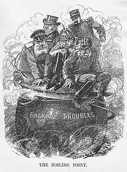 Uma charge da Punch de 2 de outubro de 1912, do cartunista inglês Leonard Raven-Hill, retratando a Grã-Bretanha, França, Alemanha, Áustria-Hungria e Rússia sentadas sobre uma tampa em cima de uma panela marcada como "Problemas dos Balcãs", satirizando a situação nos Balcãs que levou à Primeira Guerra dos Balcãs