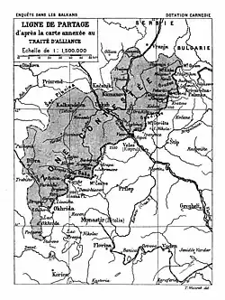 Mudanças territoriais como resultado da Primeira Guerra dos Balcãs, a partir de abril de 1913, mostrando a linha de expansão acordada antes da guerra entre a Sérvia e a Bulgária