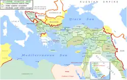 A Áustria-Hungria governada pelos Habsburgos desejava a continuação da existência do Império Otomano, já que ambos eram entidades multinacionais problemáticas e, portanto, o colapso de um poderia enfraquecer o outro. Os Habsburgos também viam uma forte presença otomana na área como um contrapeso ao chamado nacionalista sérvio aos seus próprios súditos sérvios na Bósnia, Voivodina e outras partes do império. O principal objetivo da Itália na época parece ter sido negar o acesso ao Mar Adriático a outra grande potência marítima. O Império Alemão, por sua vez, sob a política "Drang nach Osten", aspirava transformar o Império Otomano em sua própria colônia de fato e, assim, apoiava sua integridade. No final do século XIX e início do século XX, a Bulgária e a Grécia disputaram a Macedônia e a Trácia otomanas. Os gregos étnicos buscavam a "helenização" forçada dos búlgaros étnicos, que buscavam a "bulgarização" dos gregos (ascensão do nacionalismo). Ambas as nações enviaram tropas irregulares armadas ao território otomano para proteger e ajudar seus parentes étnicos. A partir de 1904, houve uma guerra de baixa intensidade na Macedônia entre os bandos grego e búlgaro e o exército otomano (a Luta pela Macedônia). Após a revolução dos Jovens Turcos de Julho de 1908, a situação mudou drasticamente. [11]