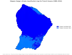 O clima é tropical, portanto, bastante chuvoso, quente e úmido na grande maior parte do ano. Os furacões que são gerados no oceano atlântico dificilmente chegam à Guiana Francesa. A temperatura média do território é de 27 °C e as precipitações superam os 3 000 mm anuais. Um dia típico na floresta da Guiana Francesa é muito quente durante o dia e chuvoso no final da tarde.