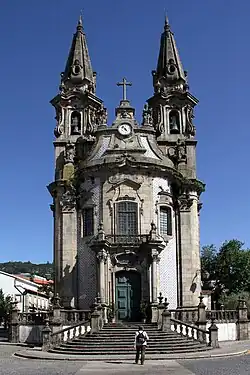 Igreja da Misericórdia, localizada no centro histórico de Guimarães, é um edifício religioso significativo que combina elementos de diferentes estilos arquitectónicos, resultantes das várias fases de construção e restauro ao longo dos séculos. É conhecida pelo seu estilo maneirista e pela sua fachada classicista[36] e pelo rico interior decorado, sendo um importante local de culto e um marco no património religioso da cidade.
