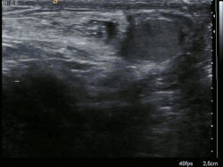 | Alça do intestino delgado (small bowel) que se projetou para o interior do saco escrotal, em direção ao testículo esquerdo. | |