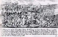 Inspirados pela Revolução Francesa de 1789 e pelos princípios dos direitos do homem, os colonos franceses e as pessoas de cor livres também pressionaram por maior liberdade política e mais direitos civis.[56] As tensões entre estes dois grupos levaram ao conflito, pois uma milícia de pessoas de cor livres foi criada em 1790 por Vincent Ogé, o que resultou na sua captura, tortura e execução.[35] Em agosto de 1791, ao perceberem uma oportunidade, os primeiros exércitos de escravos foram estabelecidos no norte do Haiti sob a liderança de Toussaint Louverture, que havia sido inspirado pelo houngan (sacerdote) vodu Boukman e apoiados pelos espanhóis da colônia vizinha de São Domingos – logo uma rebelião de escravos se espalhou por toda a colônia.[35]