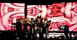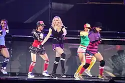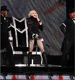 Descrita como uma "uma jornada dançante e movida a rock",[90] a Sticky & Sweet Tour foi divida nos segmentos Pimp, onde o tema proeminente era o sadomasoquismo, Old School, onde eram interpretadas músicas antigas de Madonna com exposições do falecido artista Keith Haring, Gypsy, uma fusão de música folclórica da Romênia misturada com dança, e Rave, onde eram apresentadas faixas que apresentavam influências orientais. No final dos concertos, a artista apresentava uma canção escolhida pelo público; as mais pedidas foram "Express Yourself" e "Open Your Heart". No ano seguinte, foram feitas pequenas mudanças em alguns números e, a partir de 25 de junho de 2009, ela começou a realizar uma homenagem à Michael Jackson, que faleceu naquele dia, cantando uma canção de seu repertório.[92] Os shows receberam críticas positivas dos críticos especializados.[93][94]
